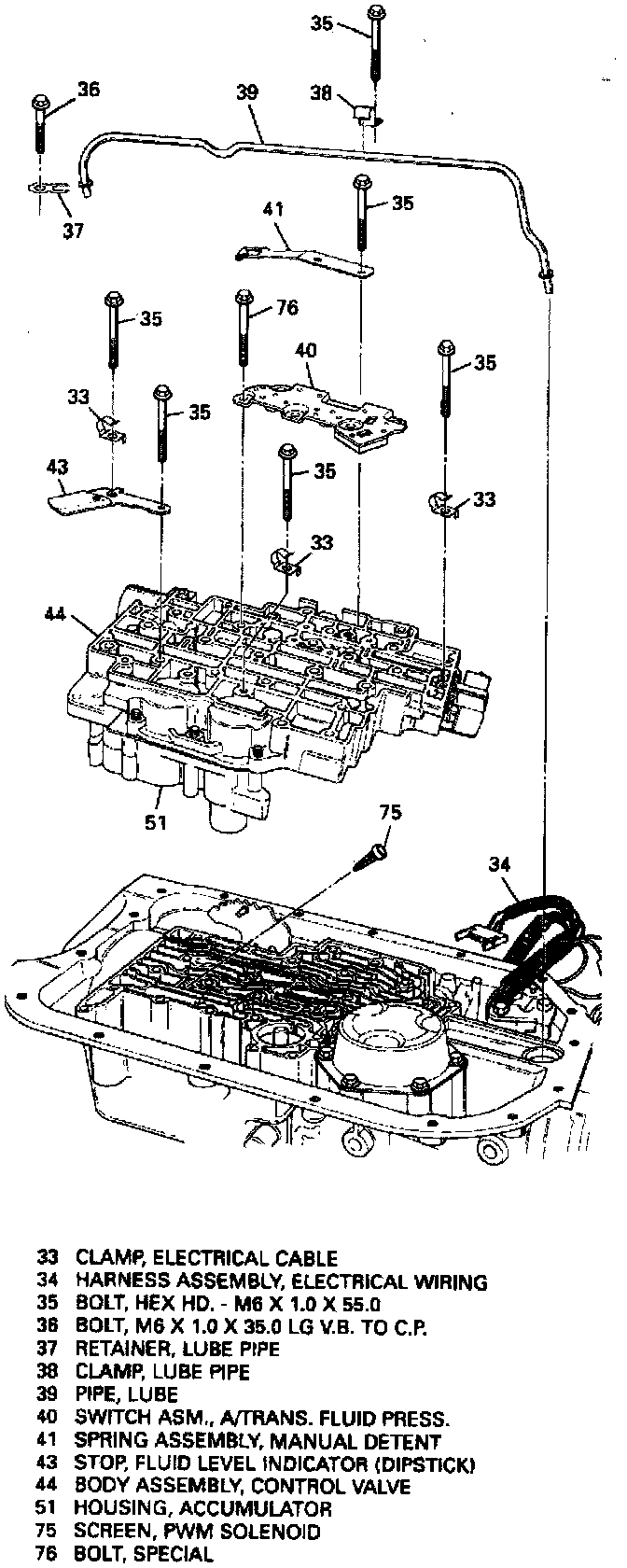 4. Twenty-one bolts (35) using 10 mm socket, from valve body assembly, manual detent spring and roller assembly (41).