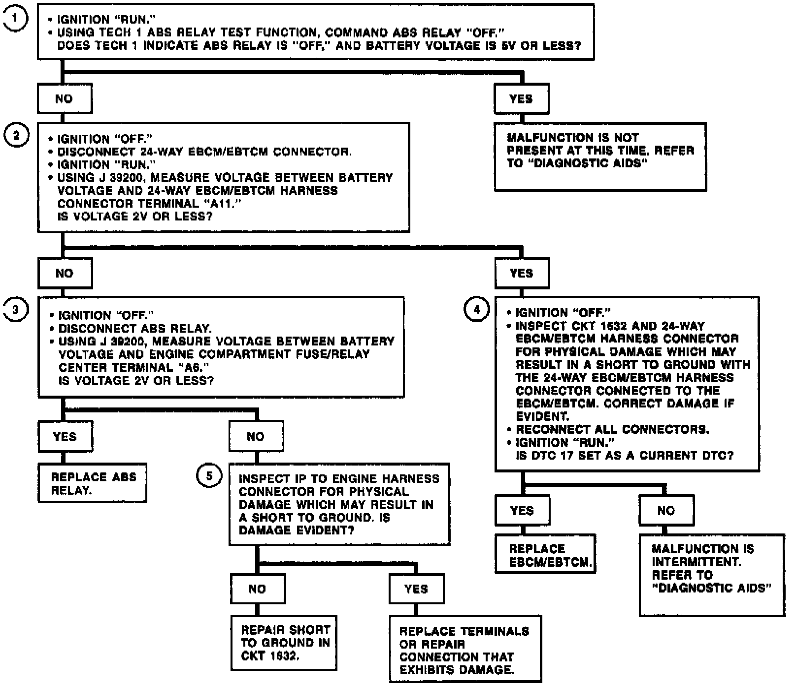 DTC 17 can be set before the EBCM/EBTCM commands the ABS relay "ON." This test determines if the ABS relay is energized when it should not be. This malfunction would not allow the ABS relay to remove power to the ABS system. If a second malfunction were to occur that requires the ABS relay to be turned "OFF," that malfunction can not be removed if the relay can not be controlled.