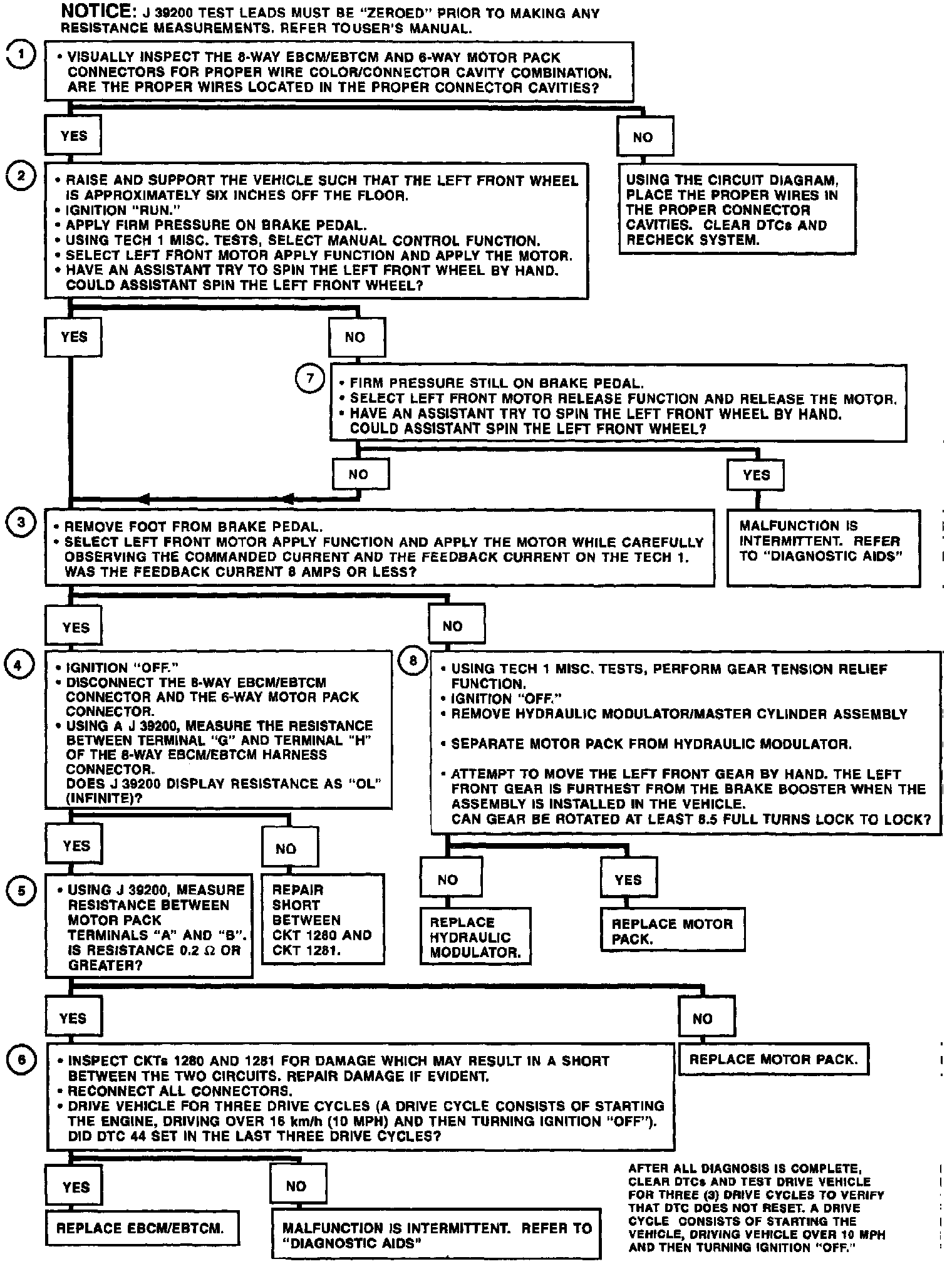 DTC 44 can be set during initialization. The EBCM/EBTCM commands the left front motor in the reverse and forward direction to ensure the motor moves properly. If the EBCM/EBTCM detects a condition in which it cannot move the motor in either direction, a malfunction exists.