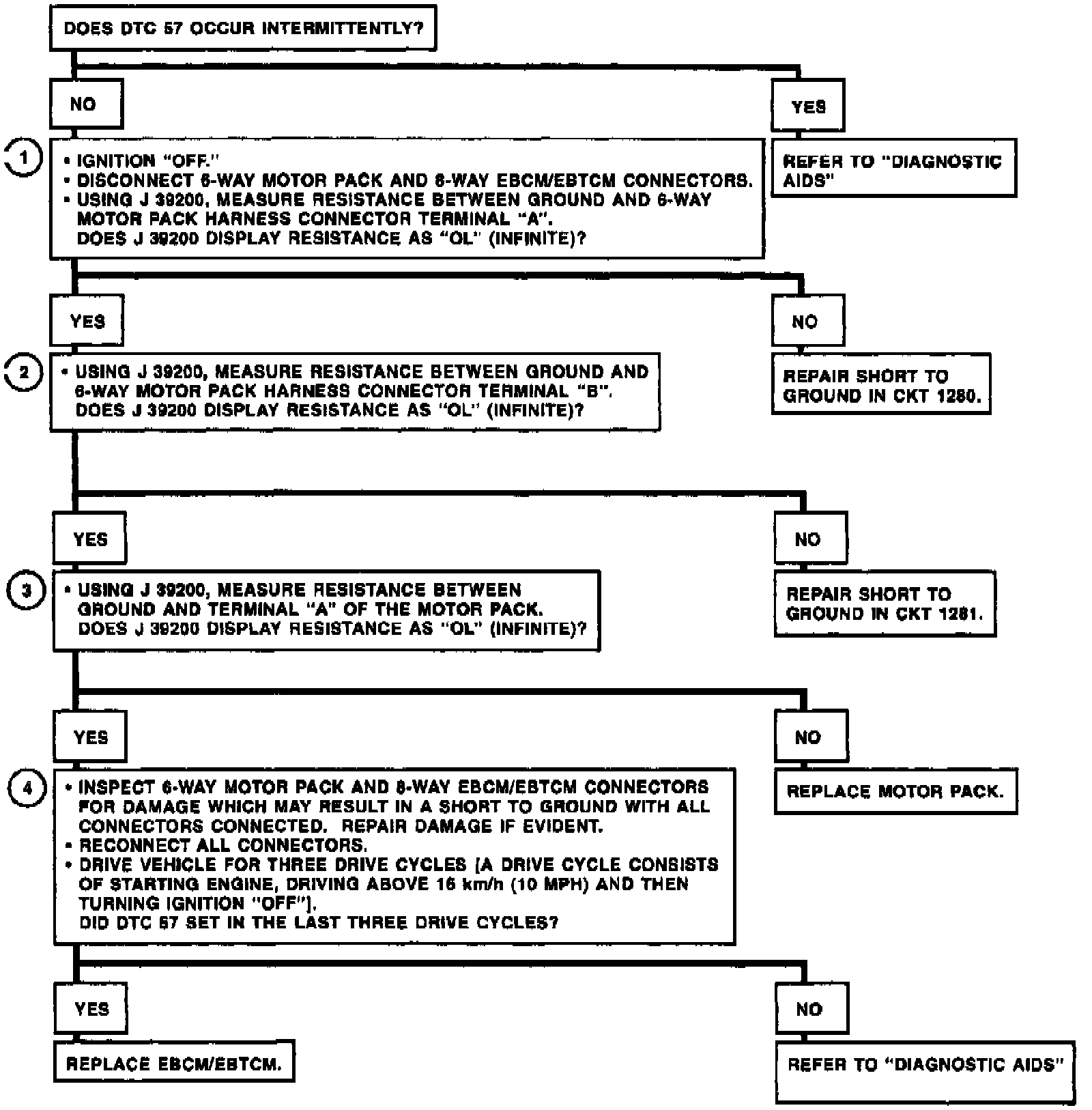 DTC 57 can be set anytime. A malfunction exists if the EBCM/EBTCM detects an out of range voltage in either of the left front motor circuits indicating a circuit shorted to ground.
