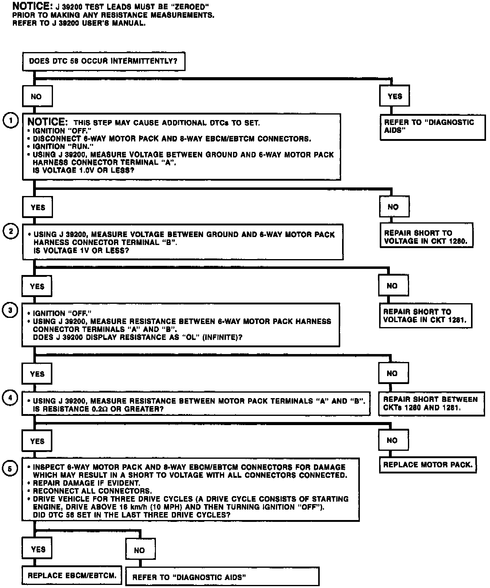DTC 58 can be set anytime. A malfunction exists if the EBCM/EBTCM detects an out of range voltage in either of the left front ABS motor circuits indicating a circuit shorted to battery or a motor shorted.