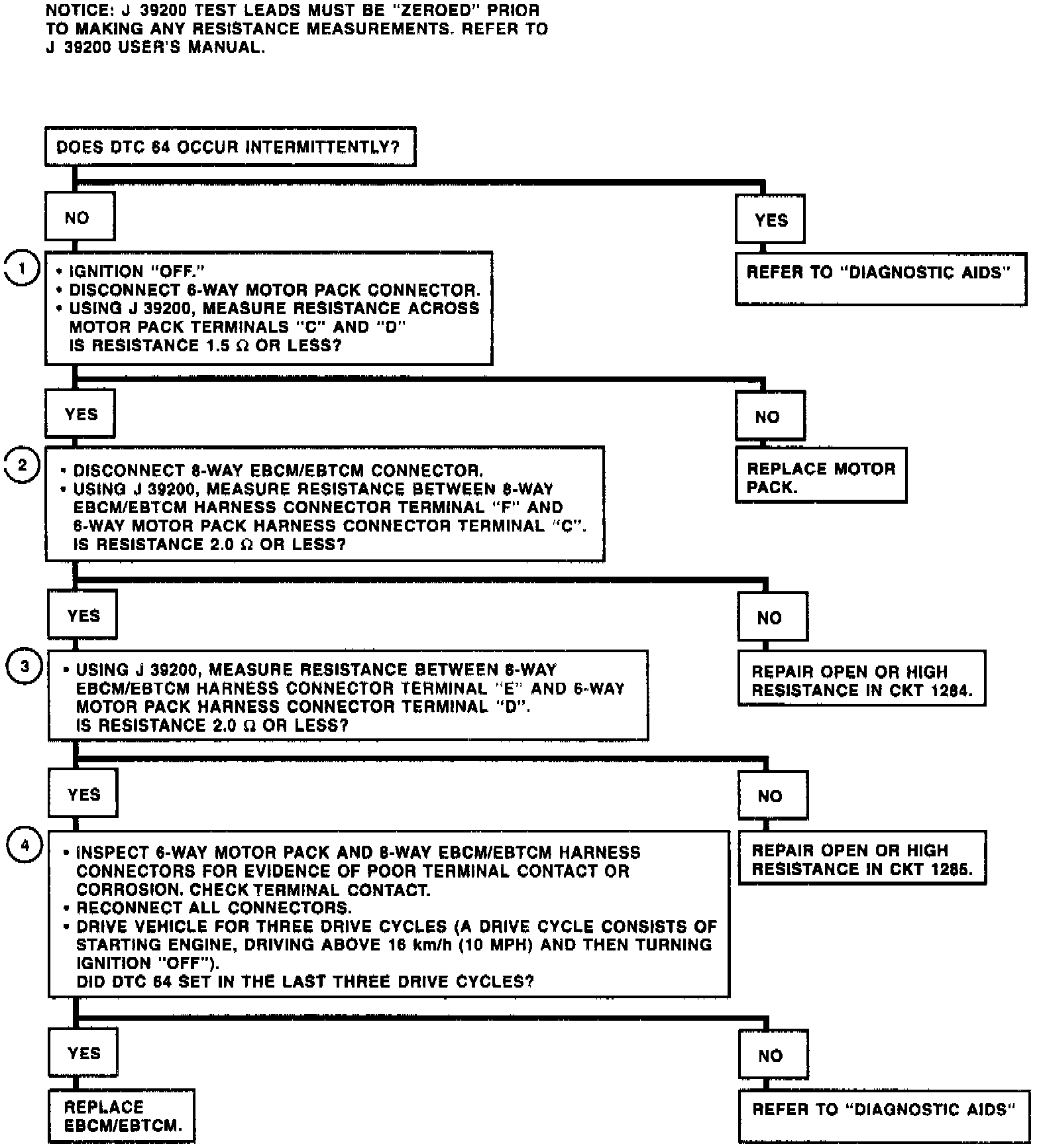 DTC 64 can be set only when the motor is commanded "OFF." A malfunction exists if the EBCM/EBTCM detects an out of range voltage in either of the rear ABS motor circuits indicating an open circuit.