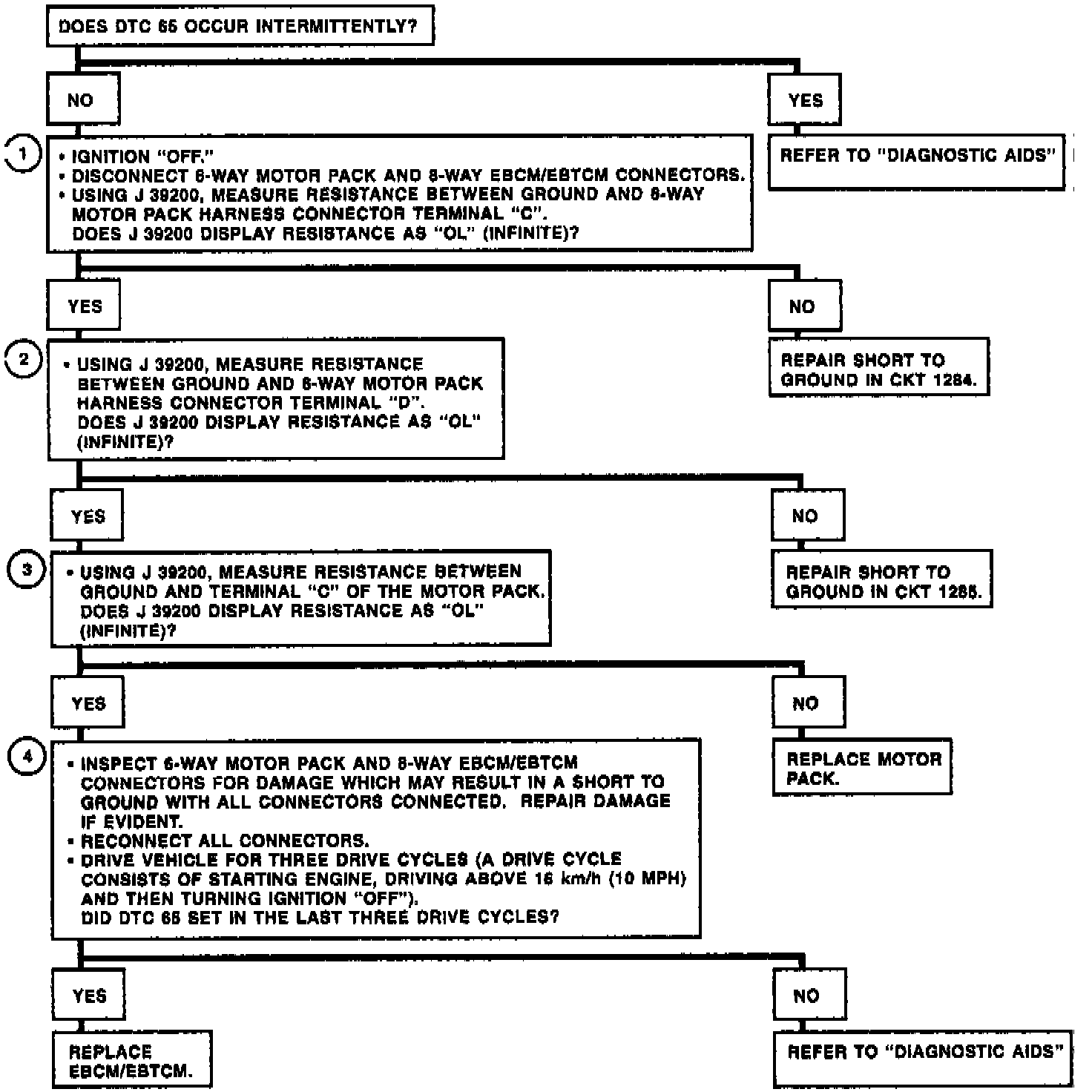 DTC 65 can be set anytime. A malfunction exists if the EBCM/EBTCM detects an out of range voltage in either of the rear ABS motor circuits indicating a circuit shorted to ground.