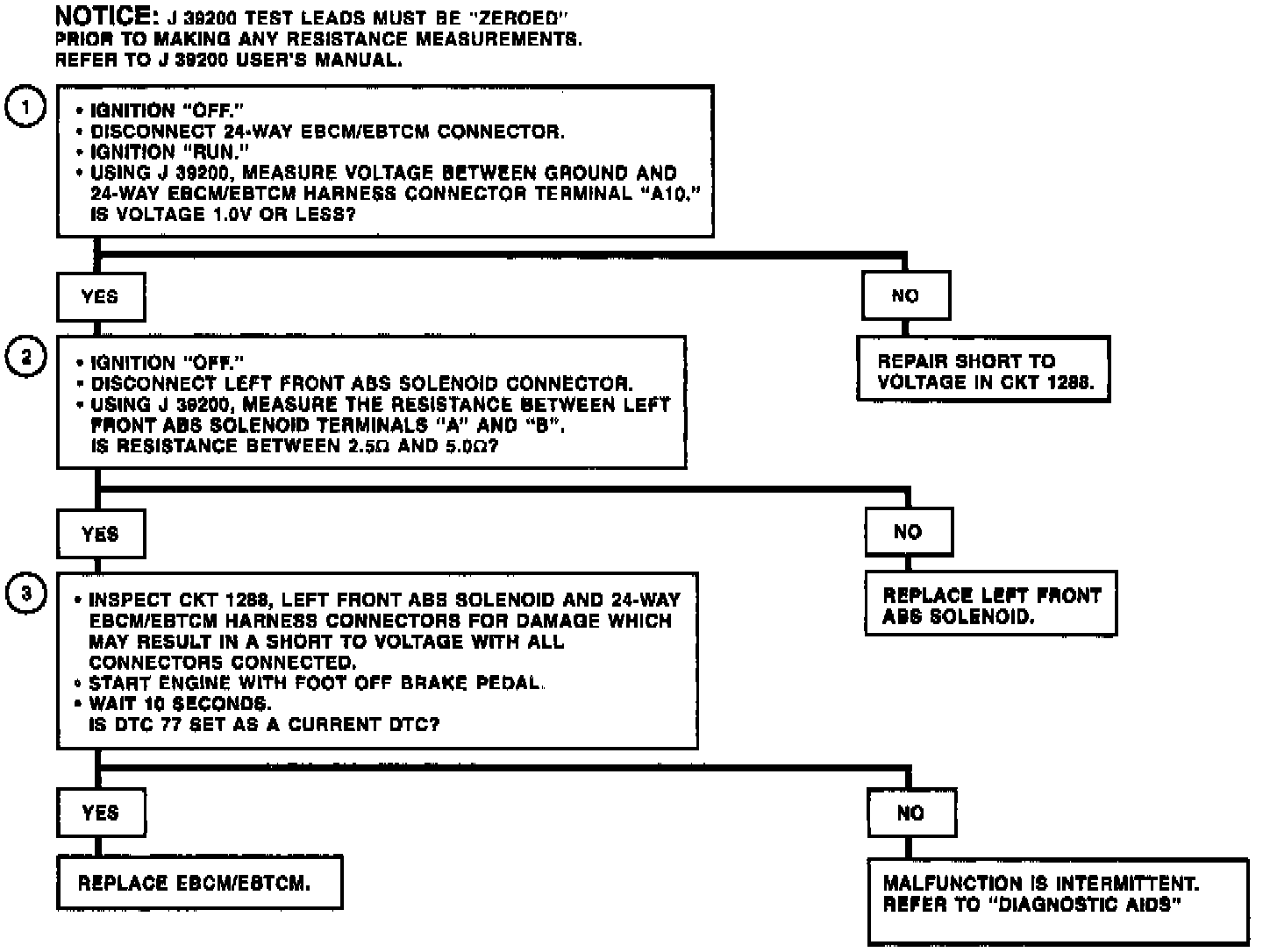 DTC 77 can be set only when the solenoid is commanded "ON." A malfunction exists if the EBCM/EBTCM detects excessive voltage in the left front solenoid control circuit.