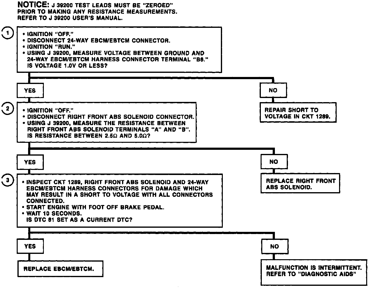DTC 81 can be set only when the solenoid is commanded "ON." A malfunction exists if the EBCM/EBTCM detects excessive voltage in the right front solenoid control circuit.