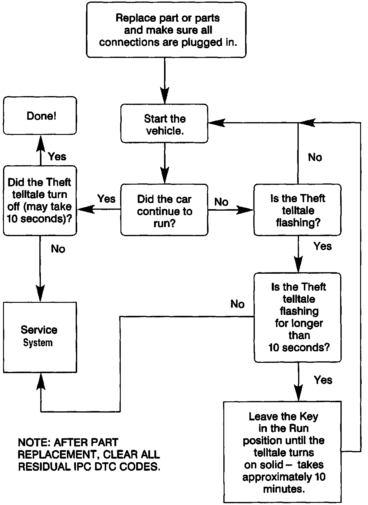 If any of these parts are replaced, the vehicle may start and stall for 10 (ten) minutes (LONG TAMPER MODE). If this occurs, the system MUST go through a LONG TAMPER MODE cycle. During this time, the THEFT TELLTALE will be flashing for the full ten minutes. The IPC and PCM require the full ten minutes to complete a learn cycle. The Ignition Key MUST remain in the "RUN" position until the telltale stops flashing or the cycle will have to be repeated.