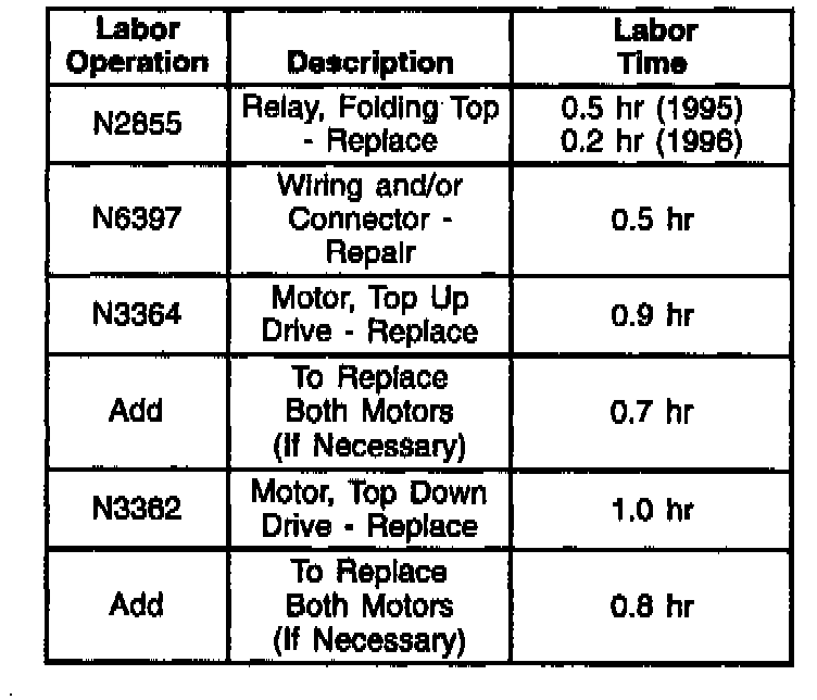 2. Refer to Section 8A-121-5 Chart # 4, RH Folding Top Motor Does Not Operate, or 81-121-6 Chart # 5, LH Folding Top Motor Does Not Operate, of the 1996 Service Manual for diagnosis.