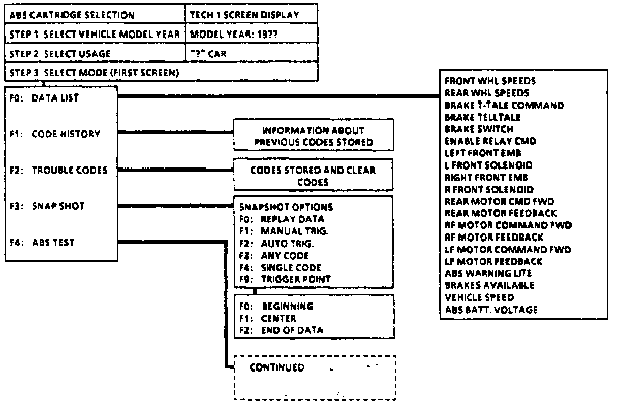 This system contains sophisticated on-board diagnostics that can be accessed with a bi-directional scan tool. To properly diagnose the anti-lock brake system, a GM TECH 1 bi-directional scan tool or suitable equivalent is necessary. The scan tool can be used to identify system faults as specifically as possible, including whether or not the fault is intermittent. The scan tool can also be used to monitor the input and output signals of the ABS Module, manually control system components and perform automated functional tests. Using the scan tool allows for accurate fault confirmation and repair verification.Fig. 92 TECH 1 Scan Tool Operation (Part 1 Of 3).: