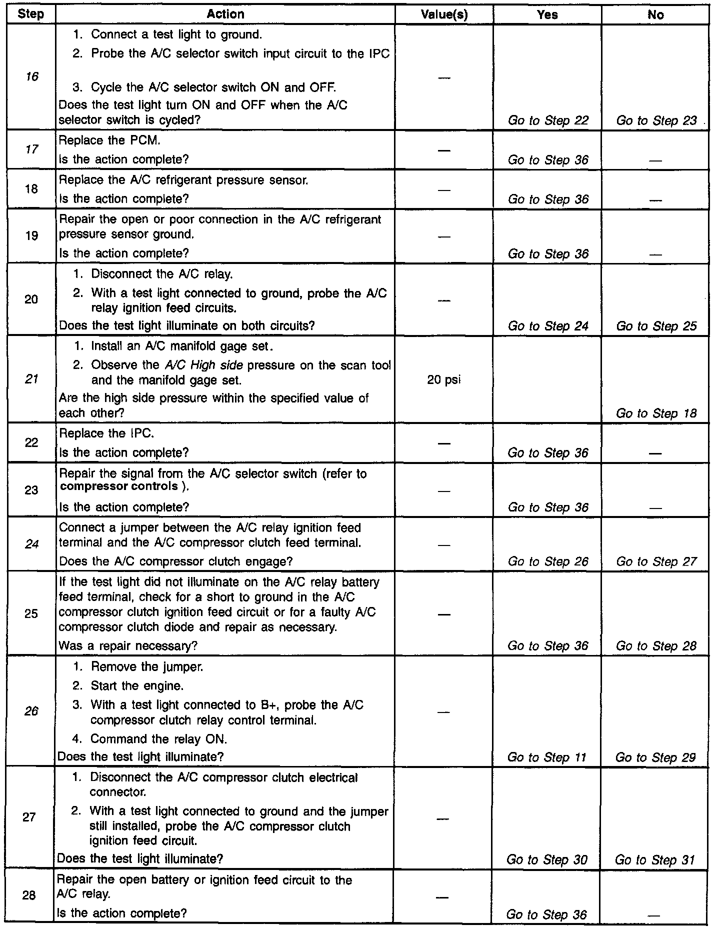 21. This step determines if the A/C refrigerant pressure sensor is out of range causing the A/C compressor clutch to be disabled or if the A/C charge is to low to allow A/C operation.