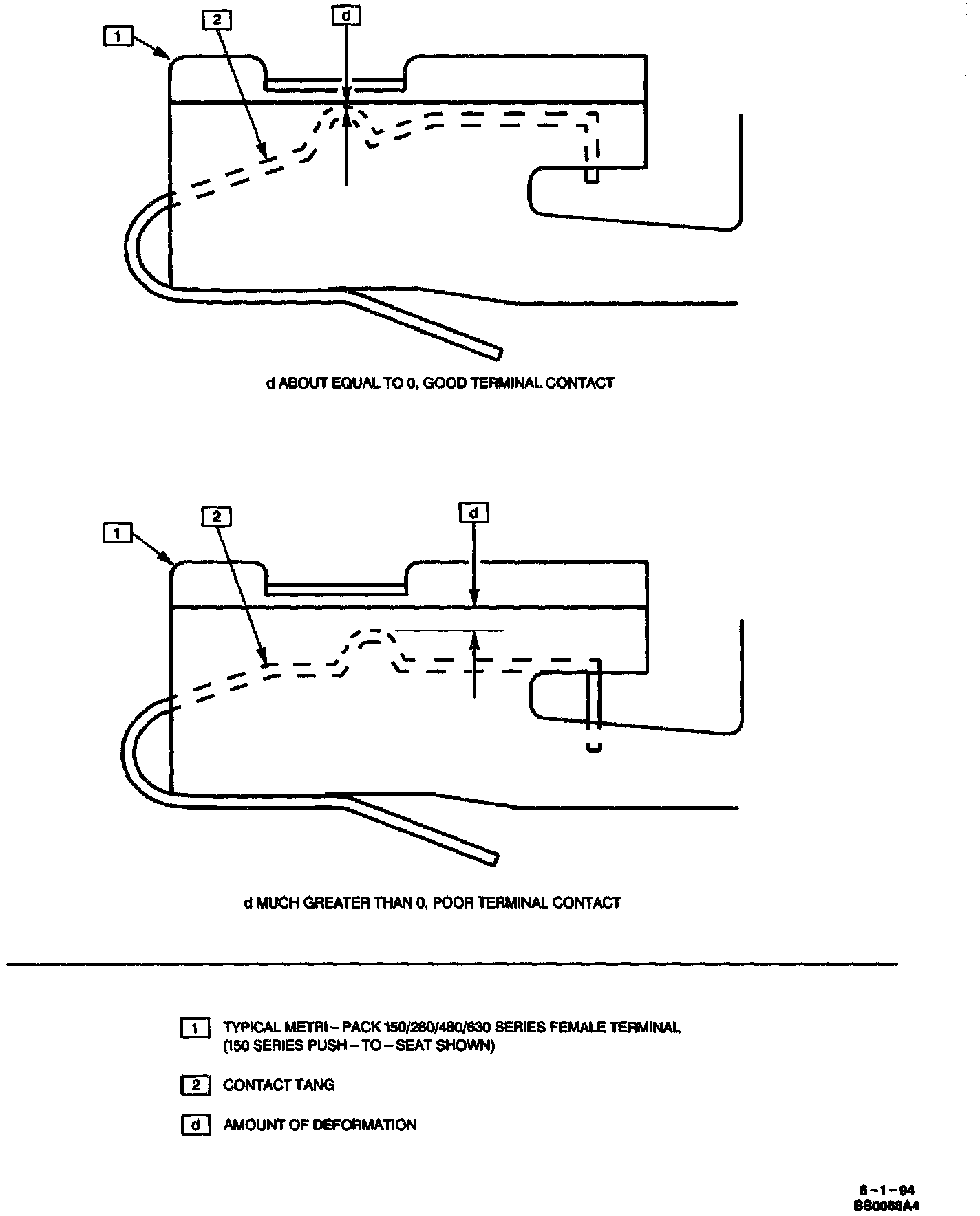 Deformation is caused by probing the mating side of a connector terminal without the proper adapter, improperly joining the connector halves or repeatedly separating and joining the connector halves. Deformation, usually to the female terminal contact tang, can result in poor terminal contact, causing an open or intermittently open circuit.