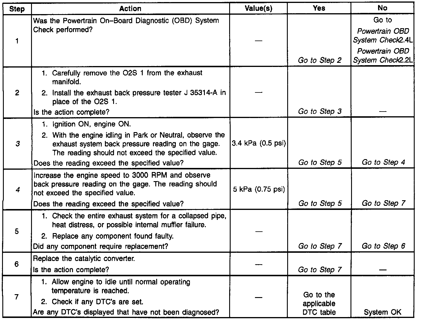 Proper diagnosis for a restricted exhaust system is essential before any components are replaced. Using the Restricted Exhaust System Check table should determine if the exhaust system is restricted. The best place for checking the exhaust system is at the O2S 1 location. Once the test is completed, coat threads with anti-seize compound P/N 5613695 or equivalent prior to O2S re-installation.