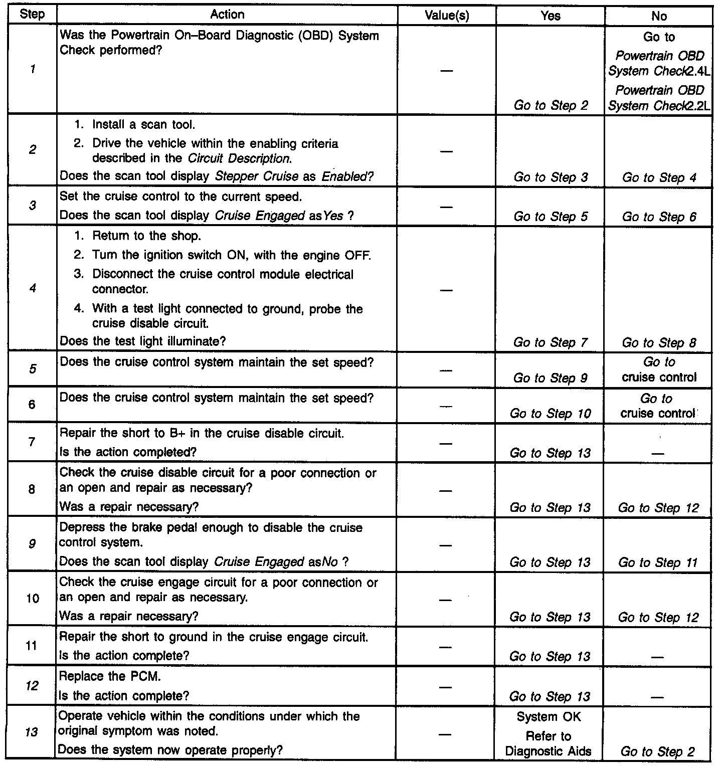^ This table will not diagnose any other cruise control system circuits other than those connected to the PCM. For diagnosis of the remaining circuits, refer to Cruise Control.