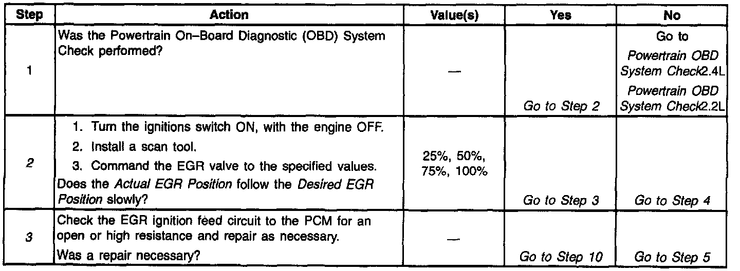 3. If the EGR ignition feed circuit is open, the EGR valve will appear lazy and slowly follow the Des fred EGR Position. The EGR valve is still receiving ignition voltage at the valve, so the fault may be either in the circuit between the PCM and the ignition feed circuit splice or the terminal connection at the PCM. If the circuit opens to the EGR valve, a DTC P1406 is set.