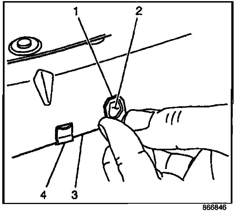1. Slide the J-nut (1) included in the harness kit on the bottom edge of the upper radiator support (3) so that it is located just to the right of the existing clip (4).
