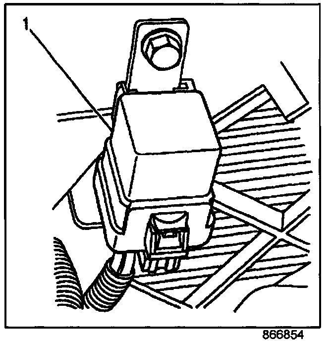 8. Using the 10 mm hex head bolt provided in the harness kit, attach the relay (1) to the radiator support using the previously drilled hole and J-nut. Tighten the bolt to 10 N.m (89 lb.in.).
