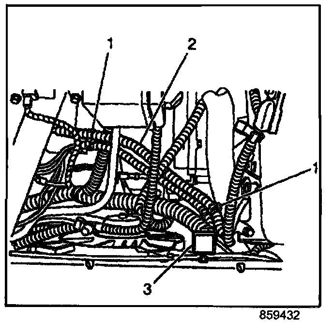 9. Route and attach the service relay harness (3) to the vehicle wiring harness (2) using the two plastic clips (1) already attached to the relay harness.