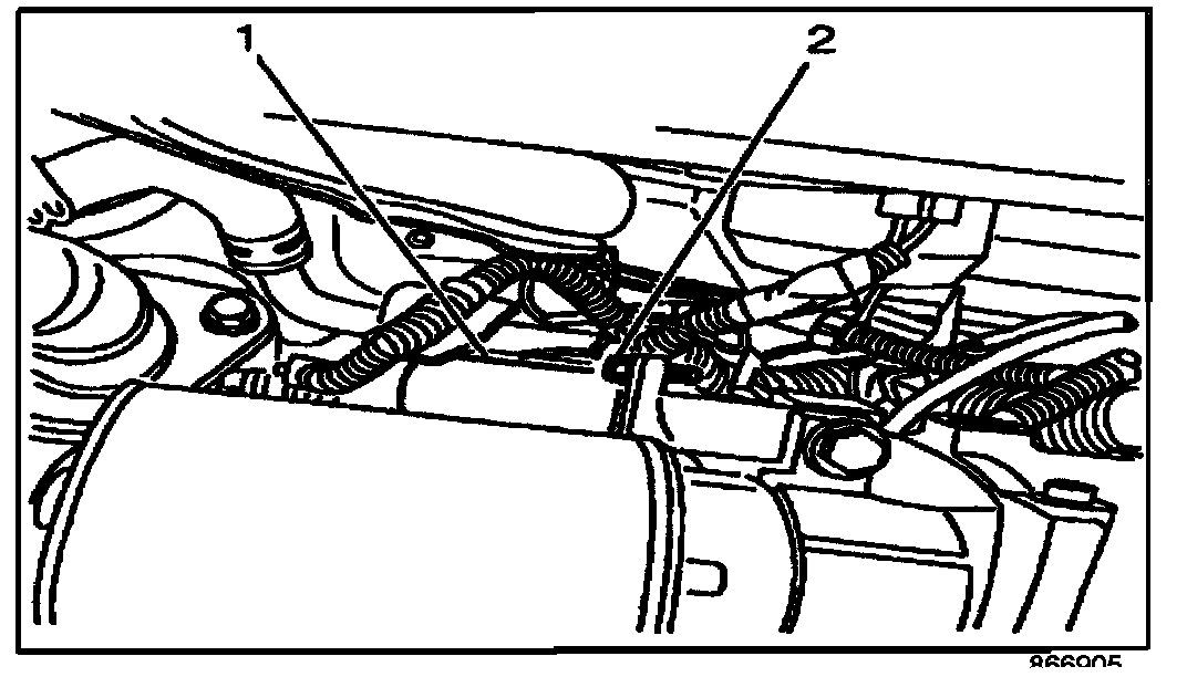 30. Remove one of the bolts (2) that attach the starter solenoid (1) to the starter motor.