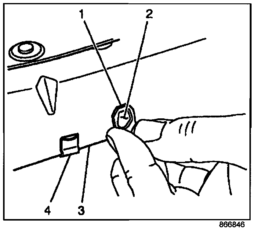 6. Slide the J-nut (1) included in the harness kit on the bottom edge of the upper radiator support (3) so that it is located just to the right of the existing clip (4).