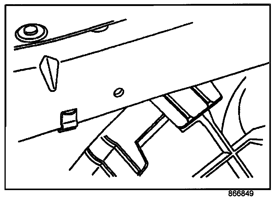 8. Remove the J-nut and using a 6.35 mm (1/4 inch) drill bit, drill a hole in the radiator support at the location marked (2) in the previous step. The above illustration shows the radiator support after the hole has been drilled.