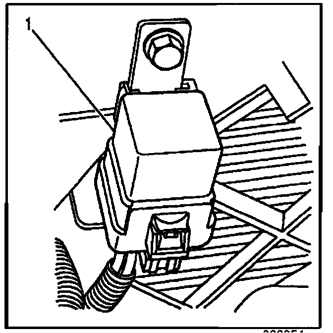 13. Using the 10 mm hex head bolt provided in the harness kit, attach the relay (1) to the radiator support using the previously drilled hole and J-nut. Tighten the bolt to 10 N.m (89 A lb.in.).