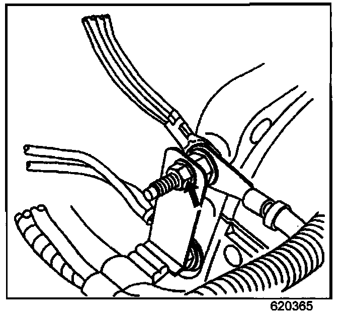 39. Clean and install the positive battery cable on the starter solenoid "B" terminal. Install the nut and tighten to 11 N.m (8 lb.ft.).
