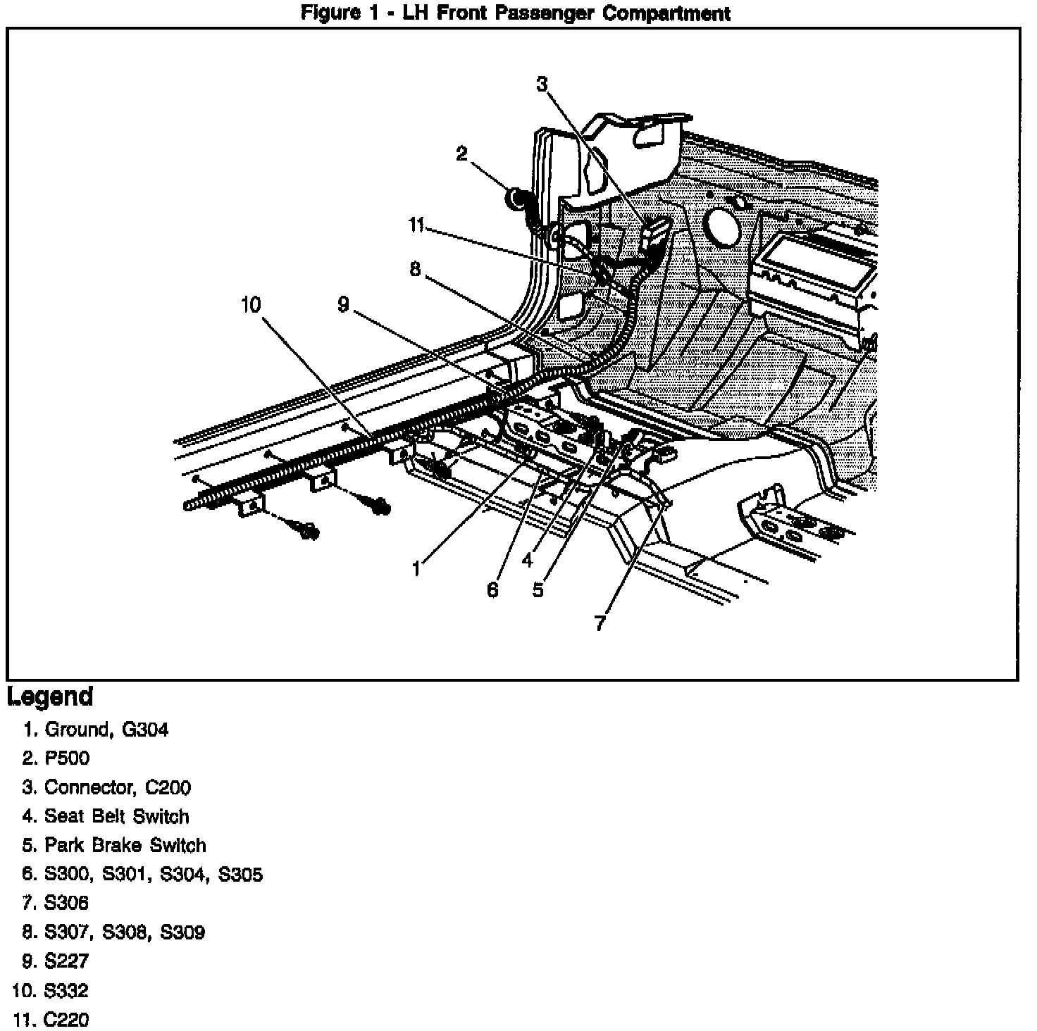 For both the 1996 and 1997 Service Manuals, all component location tables referencing the RH front corner of Passenger Compartment, page 8A-201-8, Figure 17 should read LH front corner of Passenger Compartment, page 8A-201-9, Figure 17. The following table shows the affected 8 components: