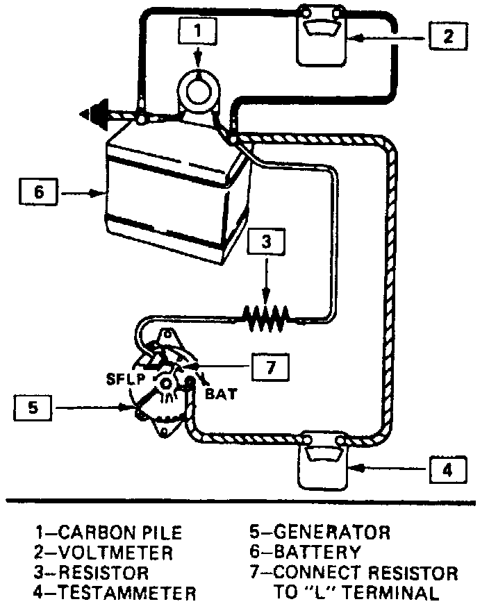 1. Make connections as shown in Fig. 4 , however leave the carbon pile disconnected. The ground polarity of the alternator and battery must be the same. The battery must be fully charged. Use a 30-500 ohm resistor between battery and L terminal.