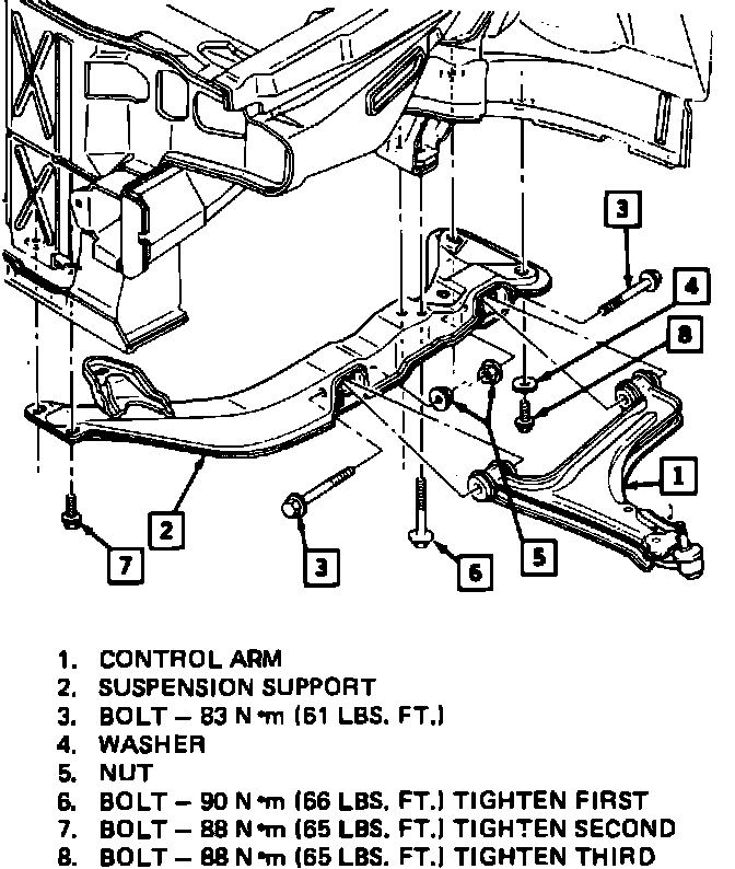 8. Attach lower control arm to control arm support. Torque pivot bolts to 61 ft. lbs.