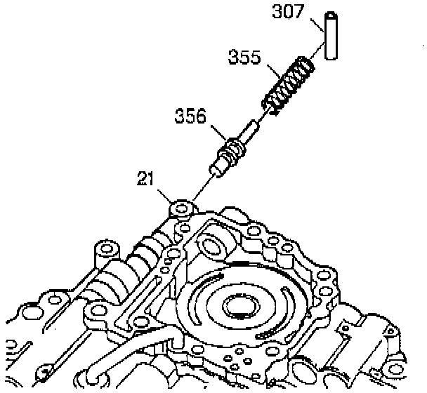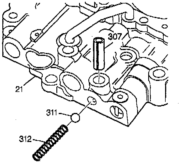 17. Remove the spring retainer pin (307) for the pressure relief ball valve from the control valve and oil pump assembly (21).