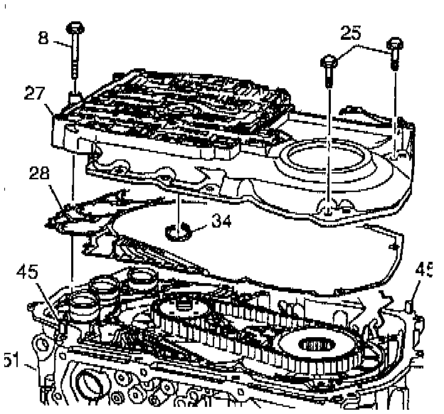3. Install a new channel plate to case gasket (28) onto the transmission case (51).