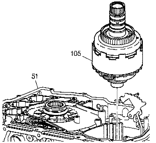 Install the direct/coast clutch and reaction carrier assembly (105) into the transmission case (51).