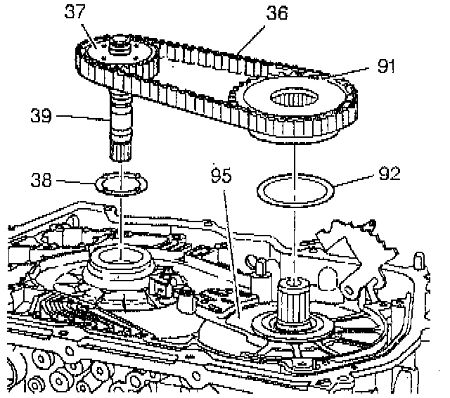 2. If the drive sprocket to drive sprocket support thrust washer (38) has not remained with the drive sprocket assembly (37 and 39), remove the drive sprocket to drive sprocket support thrust washer (38). The driven sprocket to driven sprocket support thrust washer (92) should remain with the driven sprocket support assembly (95).