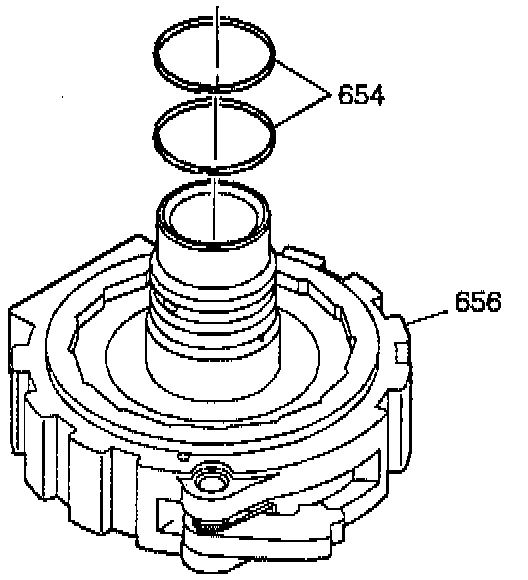 6. Assemble the lo roller clutch assembly (652) onto the forward clutch support (656). The larger tabs on the cage must face down into the forward clutch support (656). Rotate the cage slightly counterclockwise in order to lock the tabs into the grooves in the forward clutch support (656).