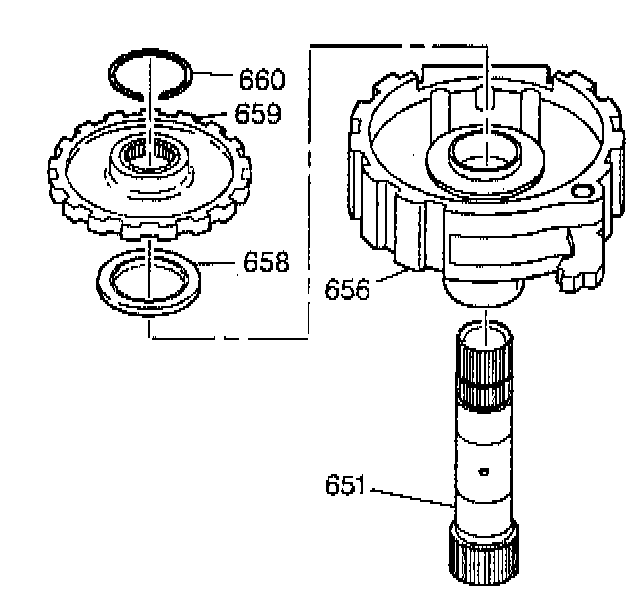 5. Assemble the snap ring (660) to the final drive sun gear shaft (651) in order to retain the parking pawl gear (659).
