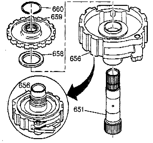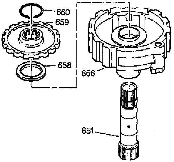 6. Remove the forward clutch support (656) from the final drive sun gear shaft (651).