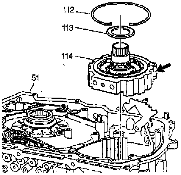 1. Install the forward clutch support and lo roller clutch assembly (114) into the transmission case (51). Compress the parking pawl spring, and line up the parking pawl with the parking pawl gear.