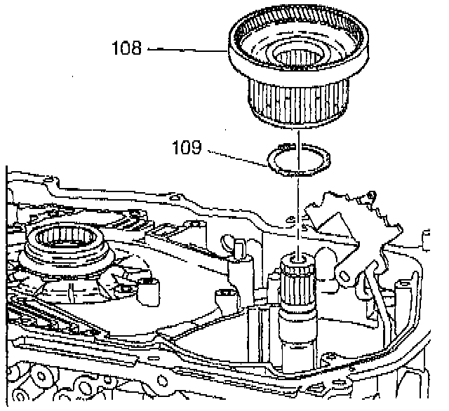 2. If the forward clutch hub to race thrust washer (109) did not remain with the forward clutch hub, remove the forward clutch hub to race thrust washer (109).