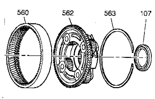 2. Remove the reaction internal gear (560) to input carrier assembly snap ring (563).