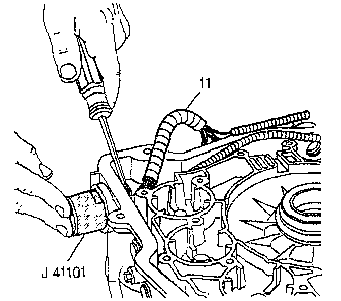 1. Push the J 41101 onto the pass-through connector from the outside of the transmission case in order to compress the pass-through connector's retaining tabs.