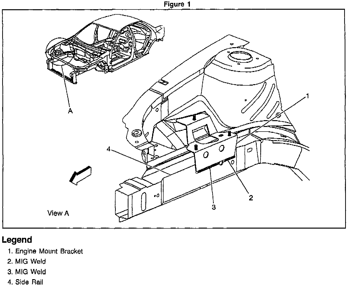 5. a. (Figure 1) - From below, grind out WELD that secures engine mount bracket to rails, or