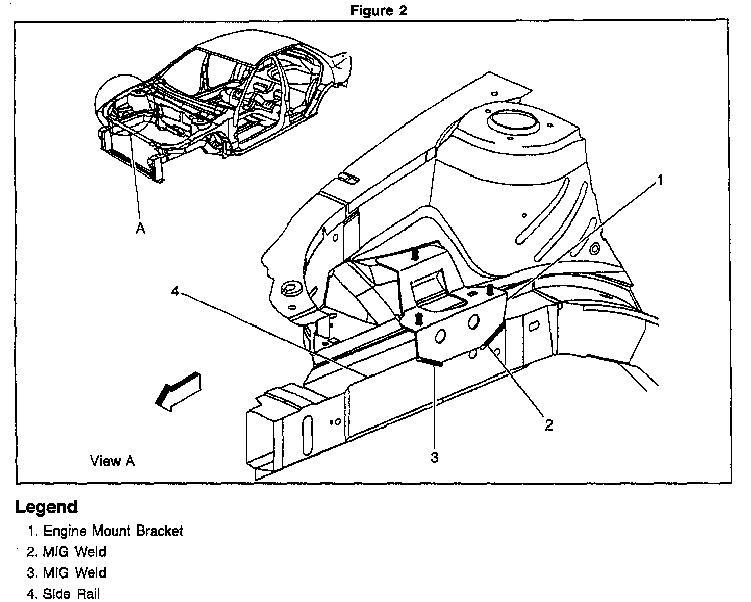 b. (Figure 2) - From below, grind out TWO WELDS that secure engine mount bracket to rail.