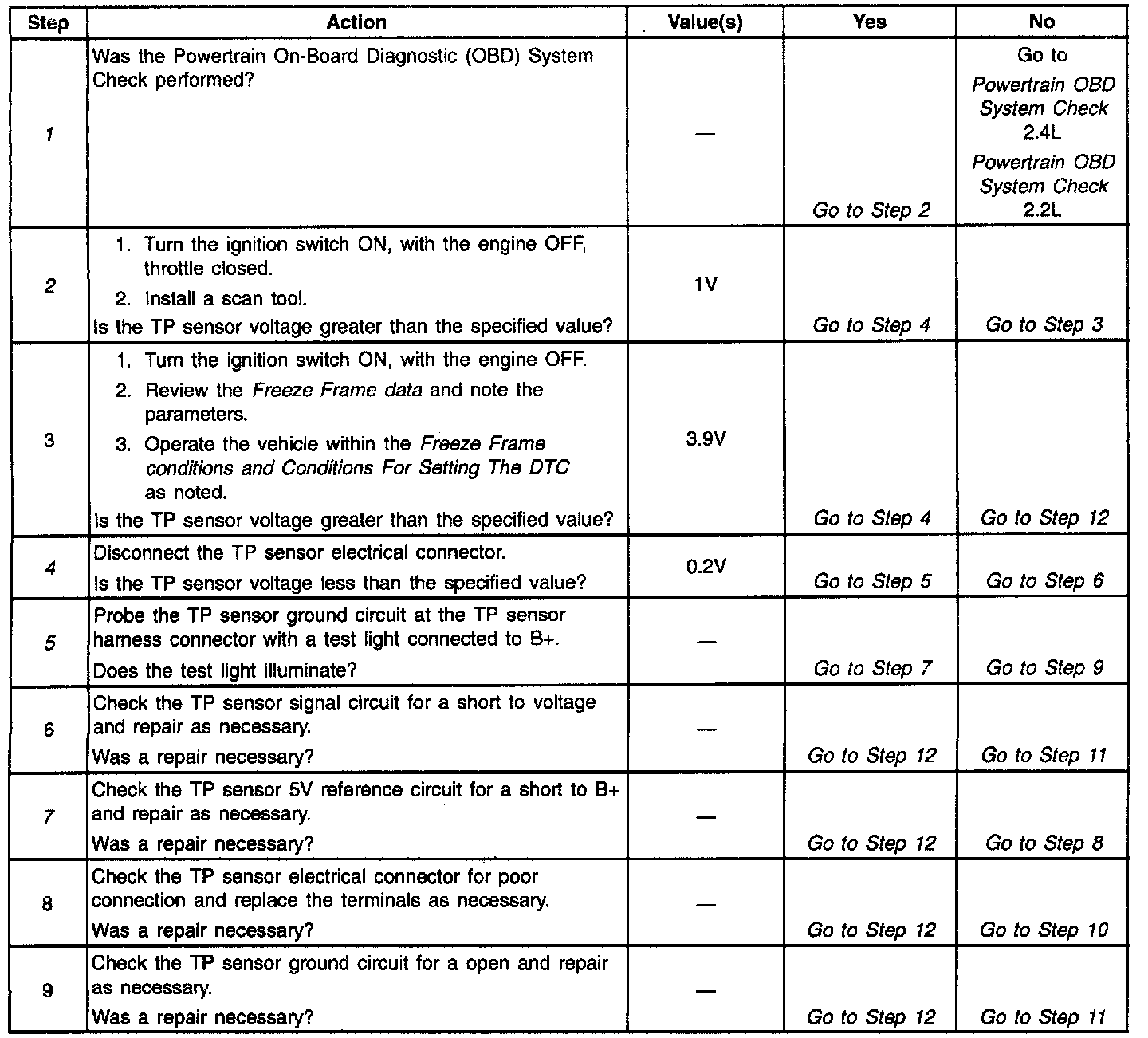 4. With the TP sensor disconnected, the TP sensor voltage should less than 0.2V if the PCM and wiring are OK.