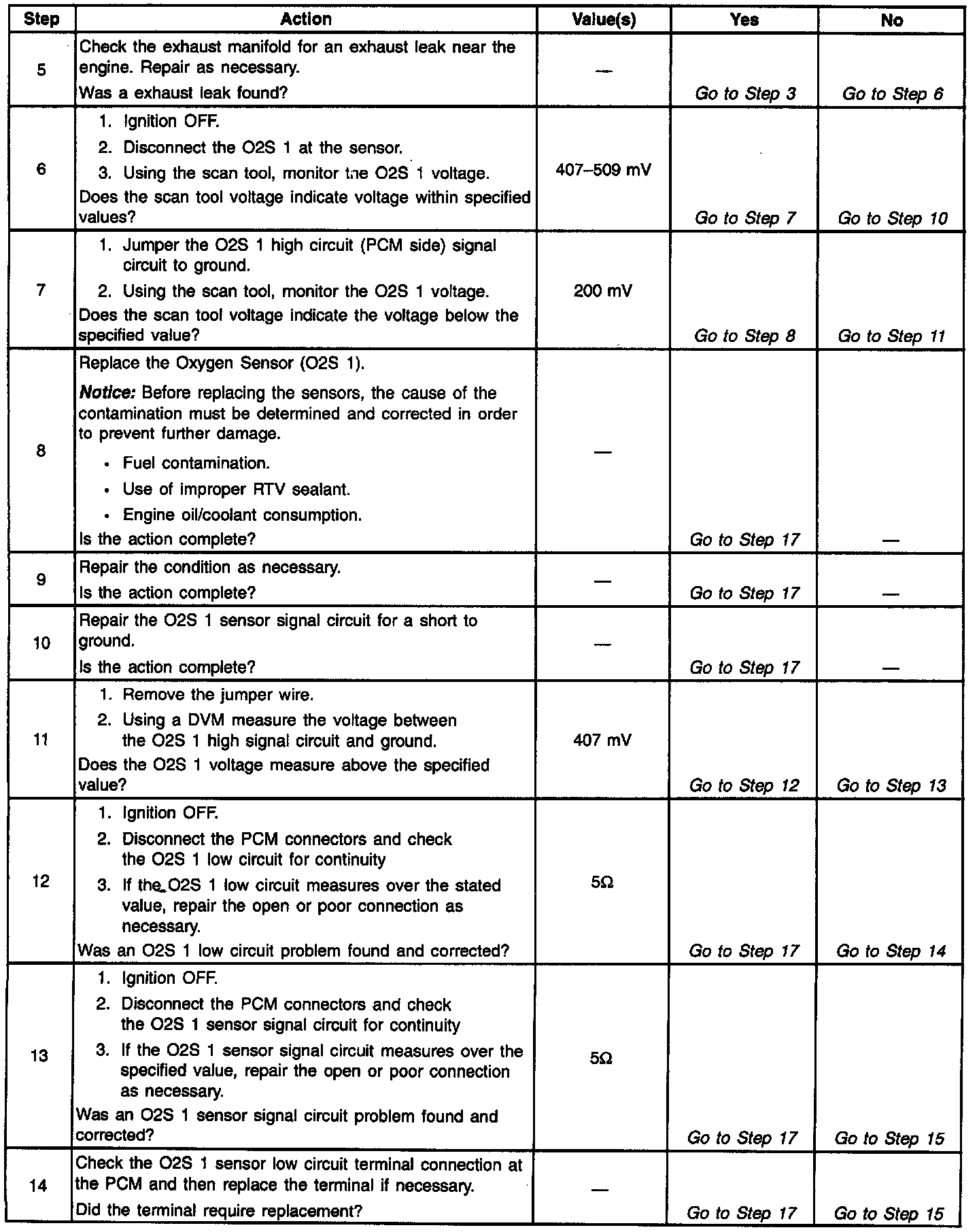 ^ O2S 1 contamination - Inspect O2S 1 for silicone contamination from fuel or use of improper RTV sealant. The sensor may have a white powdery coating and result in a high but false voltage signal (rich exhaust indication). The PCM will then reduce the amount of fuel delivered to the engine causing a severe surge or driveability problem.
