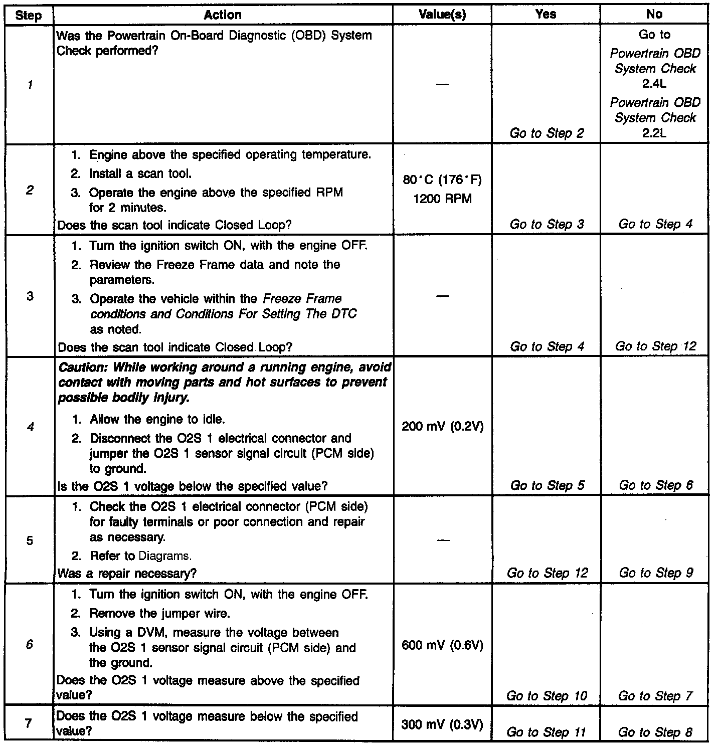 2. During engine warm-up, the O2S 1 should warm-up and its voltage output should vary between 150 mV and 850 mV. When O2S 1 voltage varies, the engine will go into Closed Loop. This step determines if the O2S 1 is operating properly.