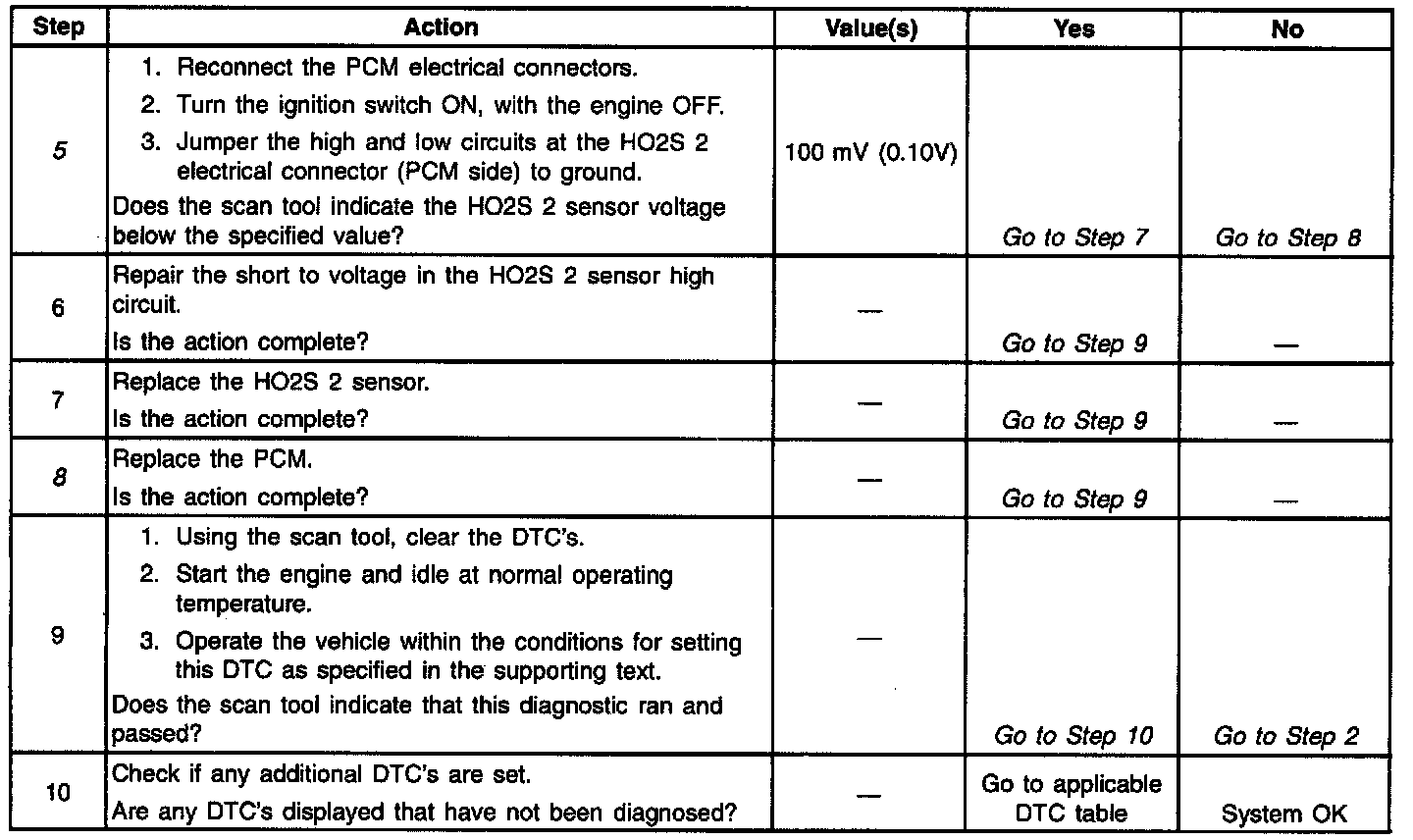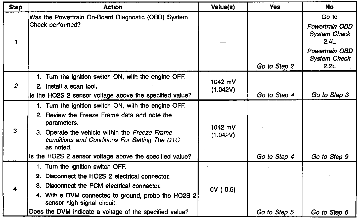 ^ Faulty HO2S 2 - If HO2S 2 is internally shorted, the HO2S 2 voltage displayed on a scan tool will be over 1 volt. Disconnect the HO2S 2 and jumping CKT 1669 to engine ground; if the displayed voltage goes from over 1000 mV to around 450 mV, replace the HO2S 2.