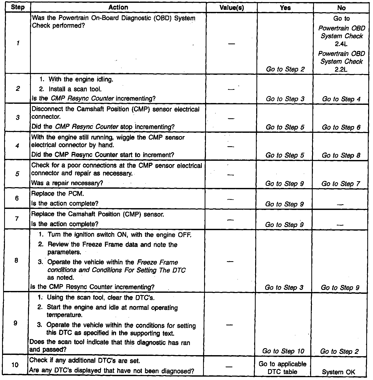 5. A poor connection in any of the circuits at the CMP sensor will cause the CMP Resync Counter to increment. Anytime a poor connection is present, the CMP Reference Activity counter will stop incrementing and the CMP Resync Counter will increment.