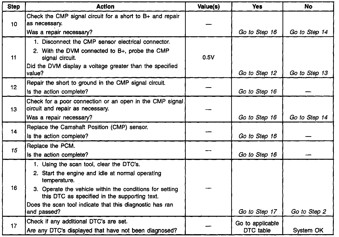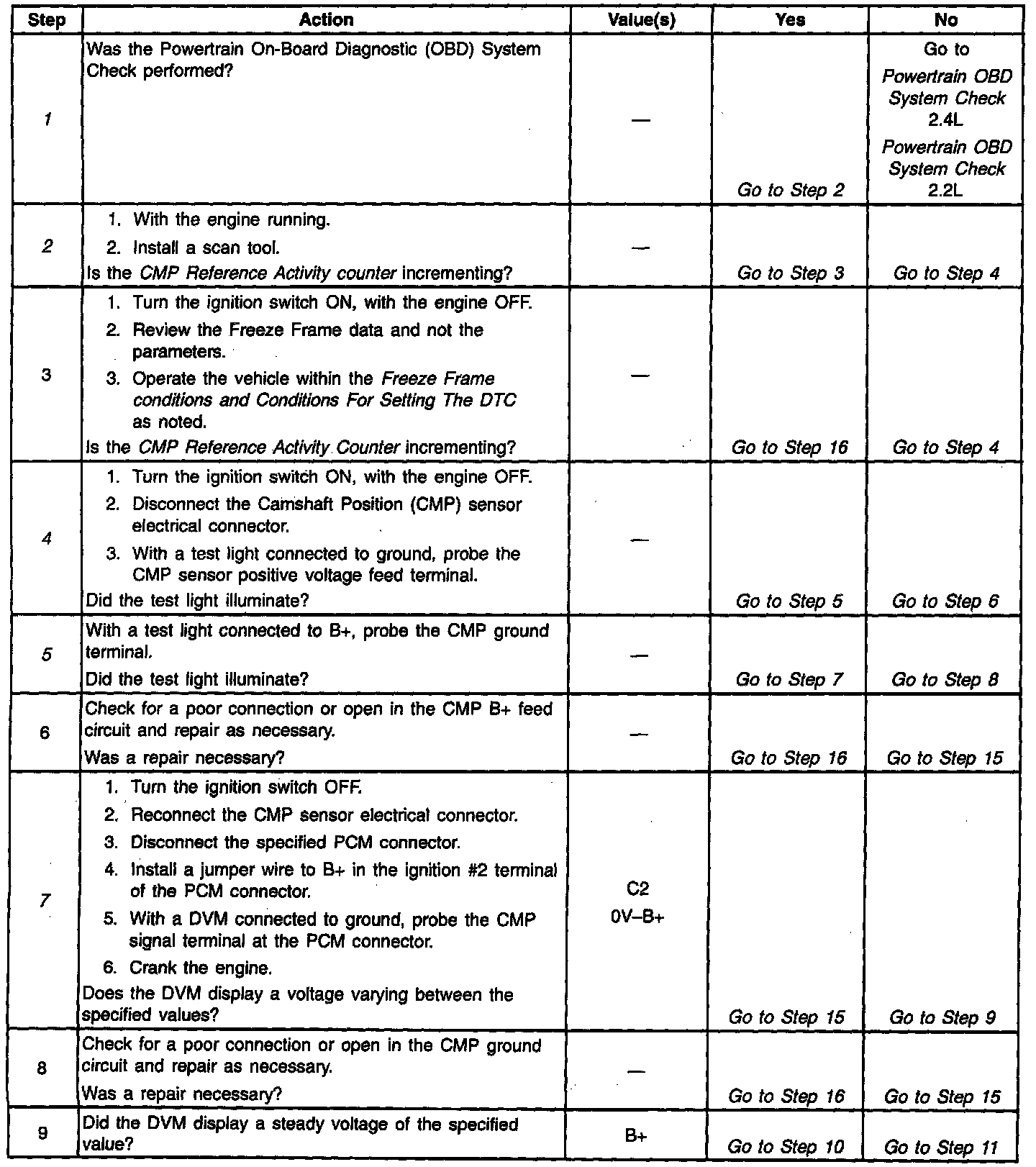 7. This step checks for a signal from the CMP sensor. It is necessary to supply B+ to the ignition feed #2 terminal in order for the CMP sensor to have B+ supplied to it. While cranking the engine, the CMP sensor will send a B+ signal and then a ground signal as the reluctor passes the sensor.
