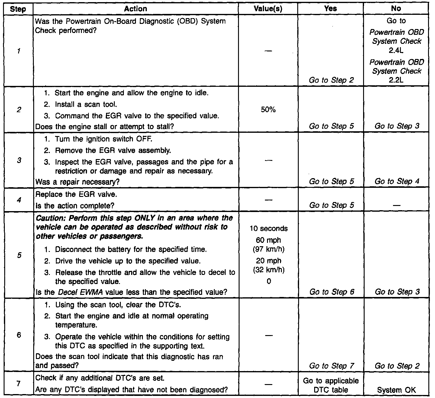 ^ A more negative number (less than 3) indicates that the system is working normally whereas a positive number indicates that the system is being restricted and that the expected amount of EGR flow is incorrect. A number that falls between negative 3 and positive 2 indicates that the system is partially restricted but not restricted enough to fail. The Decel EWMA value should always be a -3 or lower. If the Decel EWMA number becomes more positive (towards 0 or more), then the EGR system is becoming restricted. Look for possible damage to the EGR pipe or for a restriction caused by carbon deposits in the EGR passages or on the EGR valve.