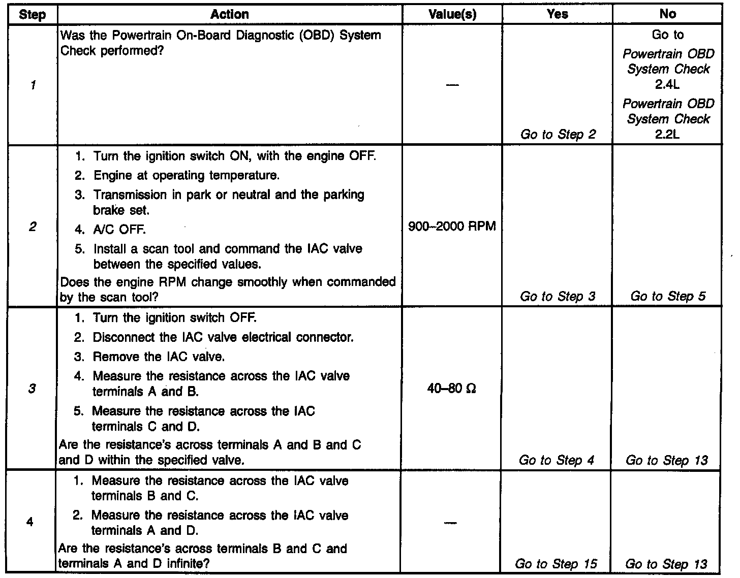 3. If the scan tool was able to command the IAC valve smoothly, a fault may still exist internally within the IAC valve. This can be checked by checking the IAC valves internal resistance.
