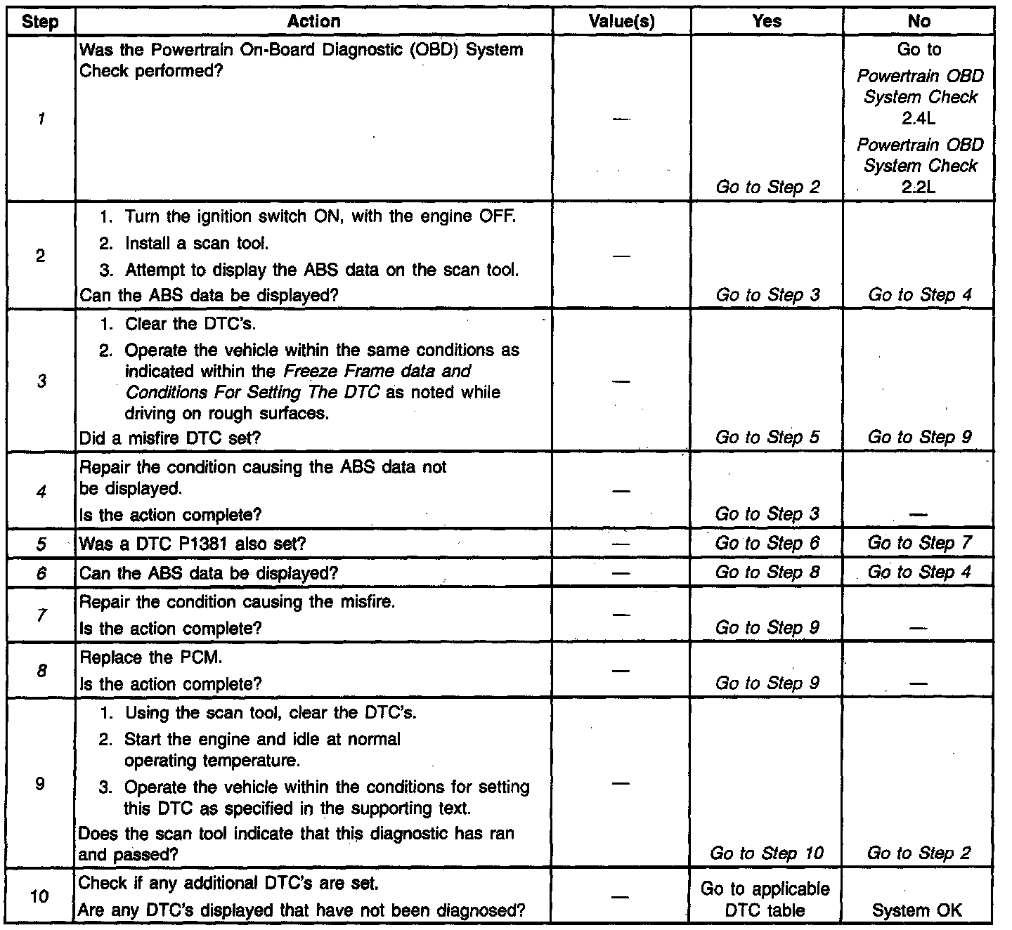 If the ABS is found to be malfunctioning, the PCM will still continue to detect for misfire. However, if a misfire DTC is set, this additional DTC will also be set, indicating that rough surface data was not usable during the misfire detection due to the ABS malfunction.